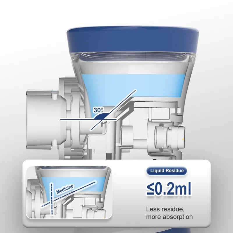 High Efficiency & Durable This portable nebulizer can run up to 120 minutes. One button operation with universal nebulisation rate of 0.2 ml/min is easy for adults and children to use. A tilting design of the 8 ml medication cup ensures full use of the drug and reduces waste (less than 0.1 ml). Also with self-cleaning mode, which significantly extends the life of the inhaler.
